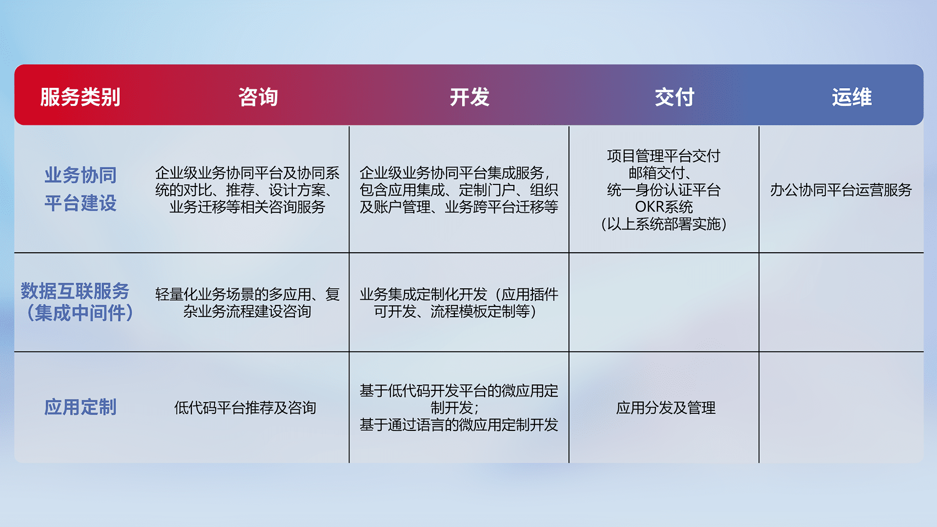 针对钉钉、、、企微、、IDaas等平台级产品提供产品的规划、、、方案、、、交付、、、、定制化开发等服务,,实现如统一协同办公、、、、智能客户服务、、、、混合会议管理、、智能数据查询、、等业务场景,,实现数字化转型。。。。